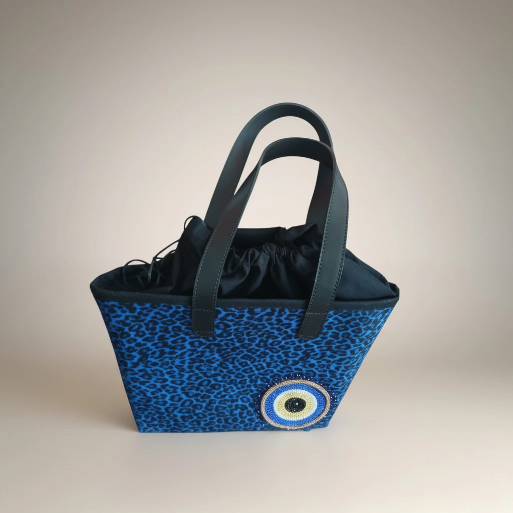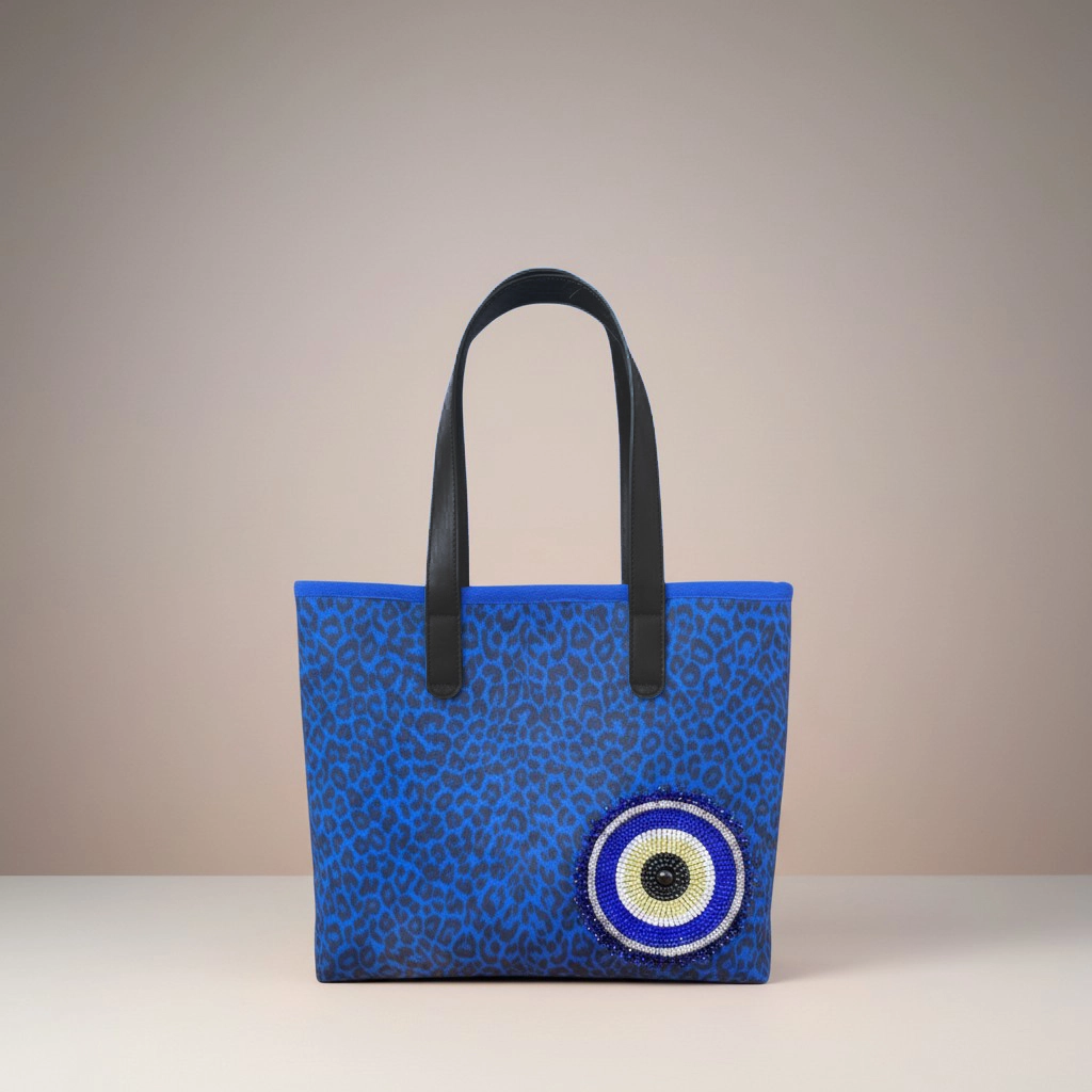 Want to add a bold and distinctive touch to your style? This handmade tote bag combines the vibrant energy of blue leopard print with the elegance of crystal evil eye embellishments, making it a striking accessory for both everyday use and special outfits.
