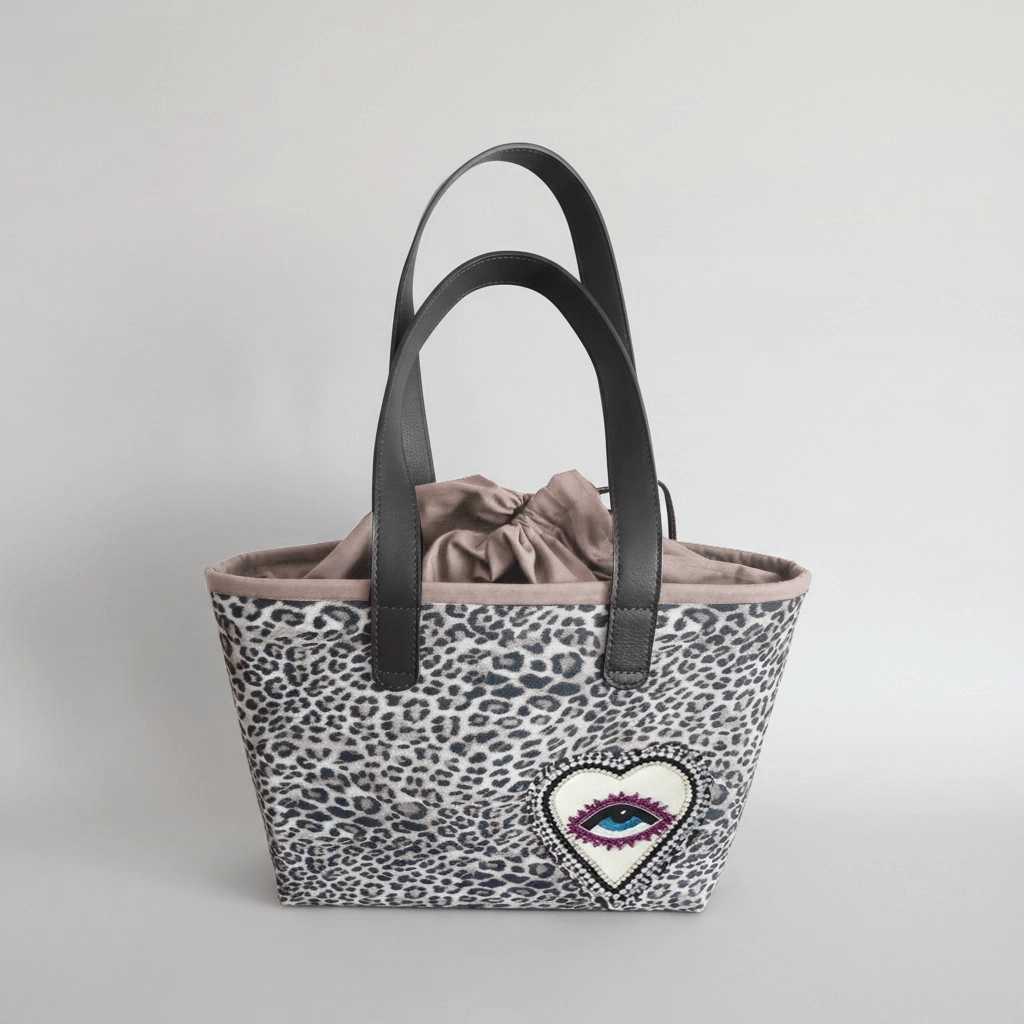 Gray leopard print tote bag with genuine leather handles and a handmade crystal eye detail. Crafted from 100% cotton with a drawstring closure and spacious interior—perfect for everyday use, shopping, or the beach. Style Virgo design.