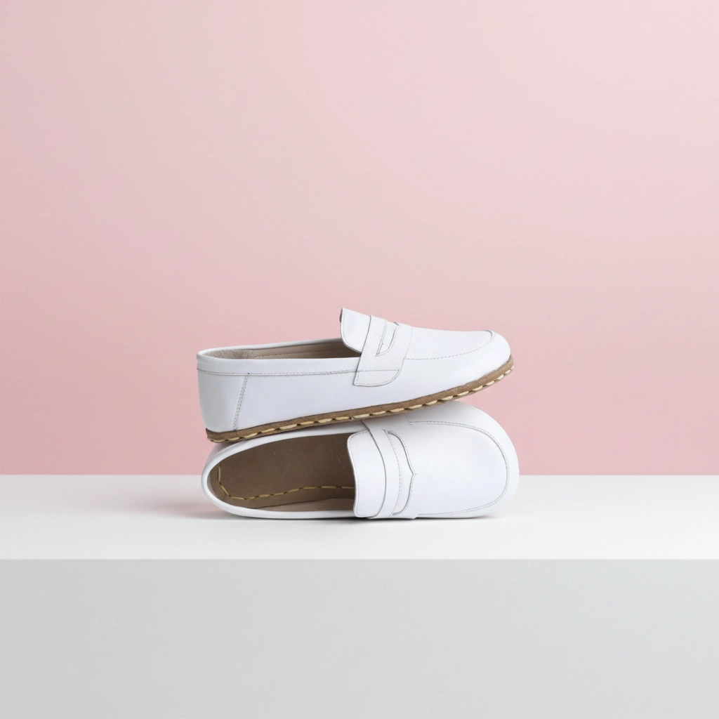 The women’s handmade white genuine leather barefoot penny loafer combines a natural walking sensation with modern style. This special design, blending minimalist shoe comfort with everyday elegance, is an ideal choice for women seeking both comfort and unique style.