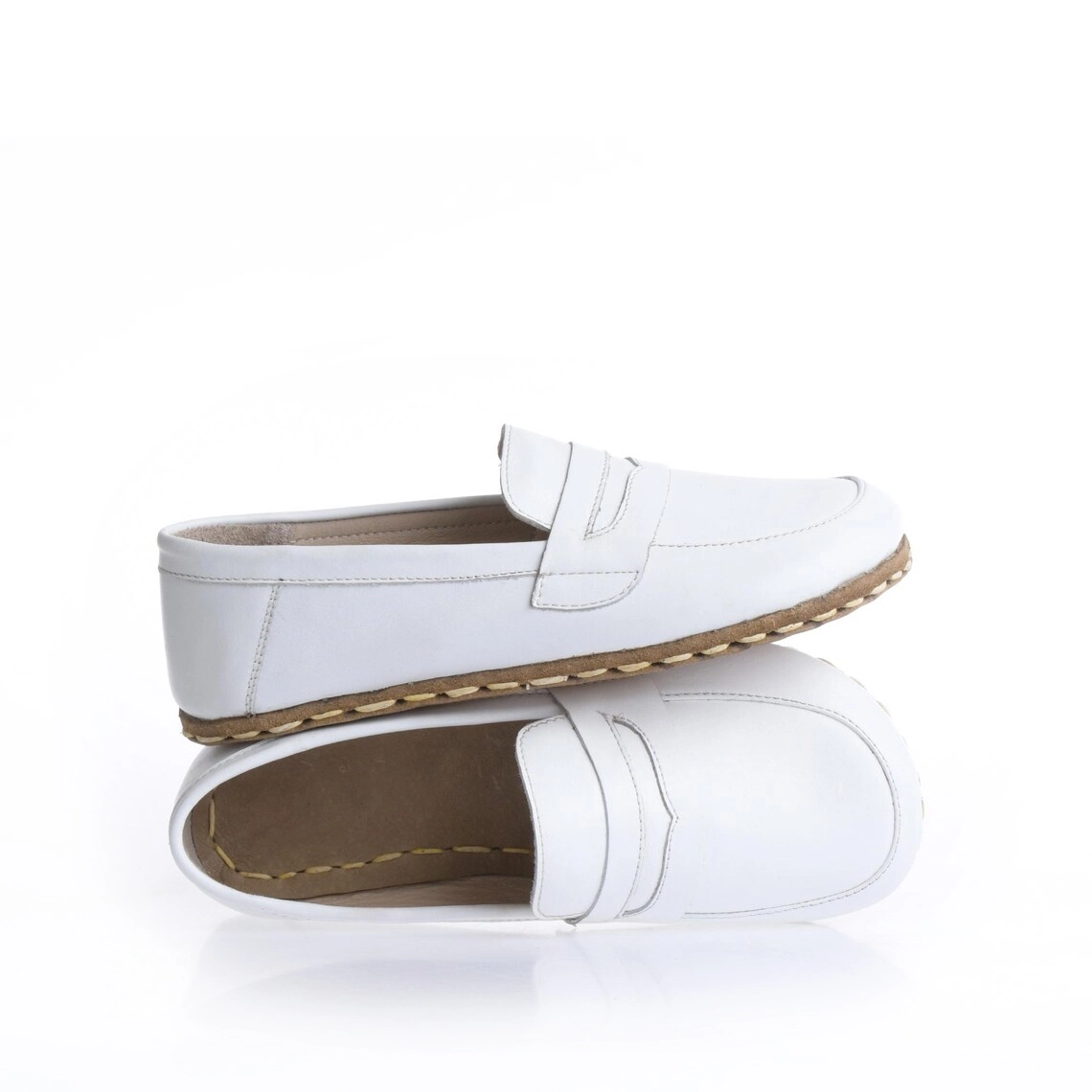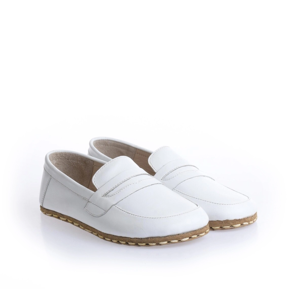 The women's handmade white genuine leather barefoot penny loafer combines a natural walking sensation with modern style. This special design, blending minimalist shoe comfort with everyday elegance, is an ideal choice for women seeking both comfort and unique style.