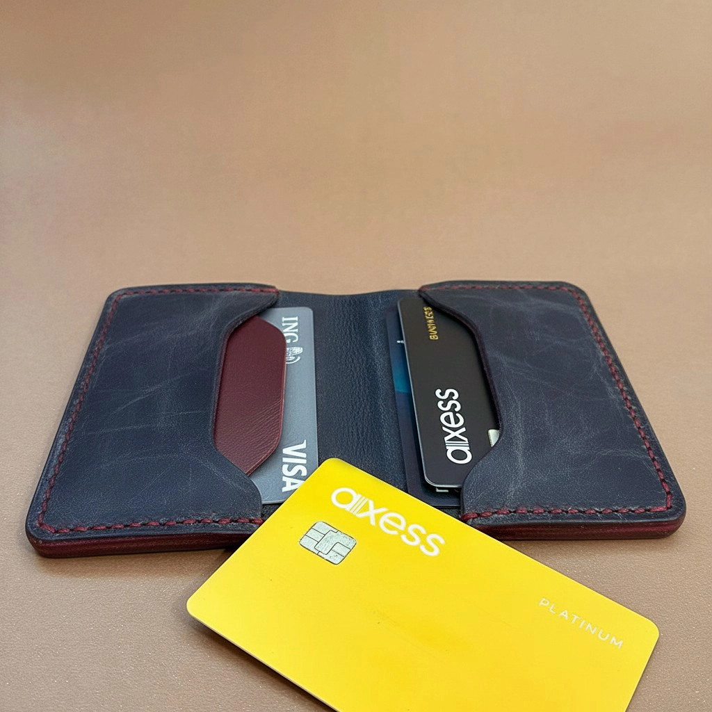 Katlanabilir Lacivert Deri Kartlık Cüzdan – 4 Bölmeli | El İmalatı Özel Tasarım – Unisex