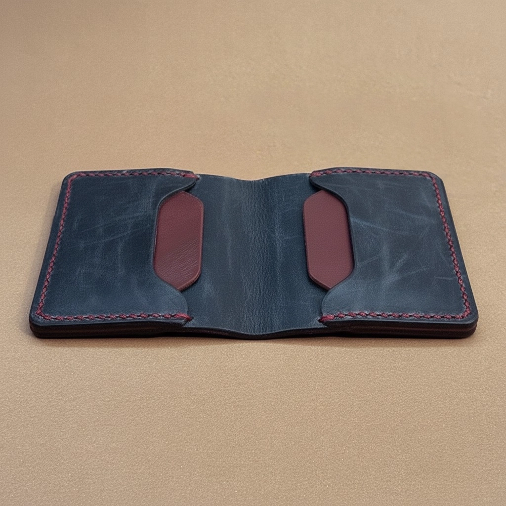 Minimalist şıklığı fonksiyonel detaylarla buluşturan BODHI deri kartlık cüzdan, günlük kullanım için tasarlanmış zarif ve pratik bir aksesuardır. El işçiliğiyle üretilen bu özel model, lacivert ve bordo tonlarının uyumuyla modern ve karakteristik bir stil sunar.